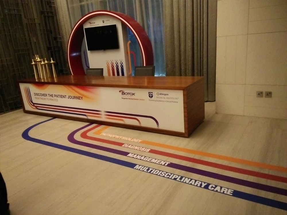 Exhibition stand designing and construction has been our main purpose. Whereas from it came the execution of event backdrops, event banners, roll-up stands, stages, stands, banner printing, event rental services, floor graphics, 3D Designs for paddocks, 3D Stand Designs, Mashrabiya Designs, Reception Counters, furniture rental, Televisions on rental for exhibition stands and many more.